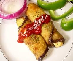large, deep skillet. Dredge eggplant slices in flour, then in egg